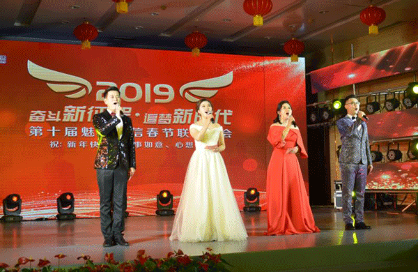 晚會(huì)以“奮斗新征程 追夢(mèng)新時(shí)代”為主題,高潮迭起,精彩紛呈,全程呈現(xiàn)出榮信大家庭“一家人,一條心,一股勁”的團(tuán)結(jié)和諧和歡樂祥和。晚會(huì)在激情澎湃的歌伴舞《我們的新時(shí)代》中拉開帷幕。隨后歌曲《中國》、《步步高》、《三德歌》、《中國人》、《感謝》、《再一次出發(fā)》等表演,充分展現(xiàn)出公司員工砥礪奮進(jìn)新征程、實(shí)干追夢(mèng)譜華章的精氣神。舞蹈《solo》、啞劇《觀影奇葩》、相聲《對(duì)春聯(lián)》、雜技《轉(zhuǎn)碟》、詩朗誦《眾志成城再出發(fā)》,小品《幸福一家人》、《婆婆也是媽》、《喜事連連過大年》等節(jié)目,迎來一波又一波的鼓掌叫好聲。最后,晚會(huì)在激情昂揚(yáng)的歌曲大合唱《走向富強(qiáng)》中圓滿落下帷幕。演出結(jié)束后,總經(jīng)理司相芳、副總經(jīng)理高小明、副總經(jīng)理李繼新等集團(tuán)領(lǐng)導(dǎo)上臺(tái)與演職人員親切握手并合影留念,共同祝賀晚會(huì)取得圓滿成功。